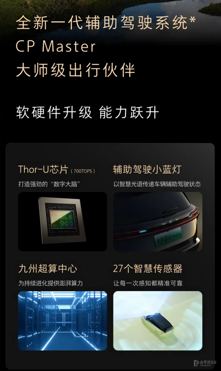 在驾驶辅助方面,是此次升级的重点,将搭载搭载VLA大模型,配备全新一代CPMaster辅助驾驶系统,配1颗英伟达Thor-U芯片(算力700TOPS)、1颗128线激光雷达、12颗超声波雷达、11颗感知摄像头以及3颗毫米波雷达共27个智驾传感器,可实现无图全场景NOA、跨层记忆泊车、自动泊车、循迹倒车等功能,同时支持自然语言对话,辅助驾驶过程中,“听得懂”用户的真实需求,通过呼唤“小魏同学”激活语音助手,说出“帮我起步”或“远离大车”等语音指令,即可快捷实现对辅助驾驶行为的控制。