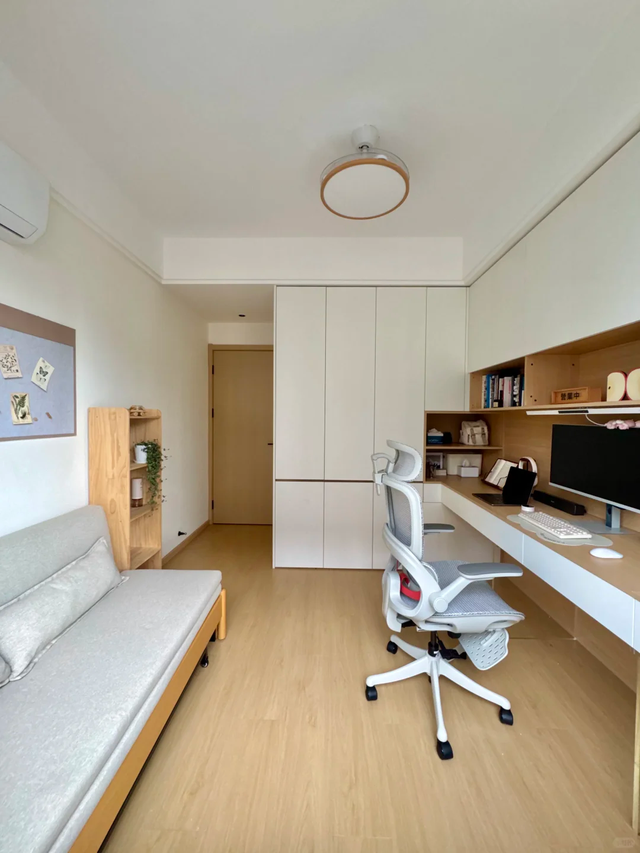 网友@千浔的次卧更绝:不放床不做榻榻米,进门左手边做儿童衣柜,连接衣柜延伸出双人书桌,靠窗摆一张 1.8 米沙发床。