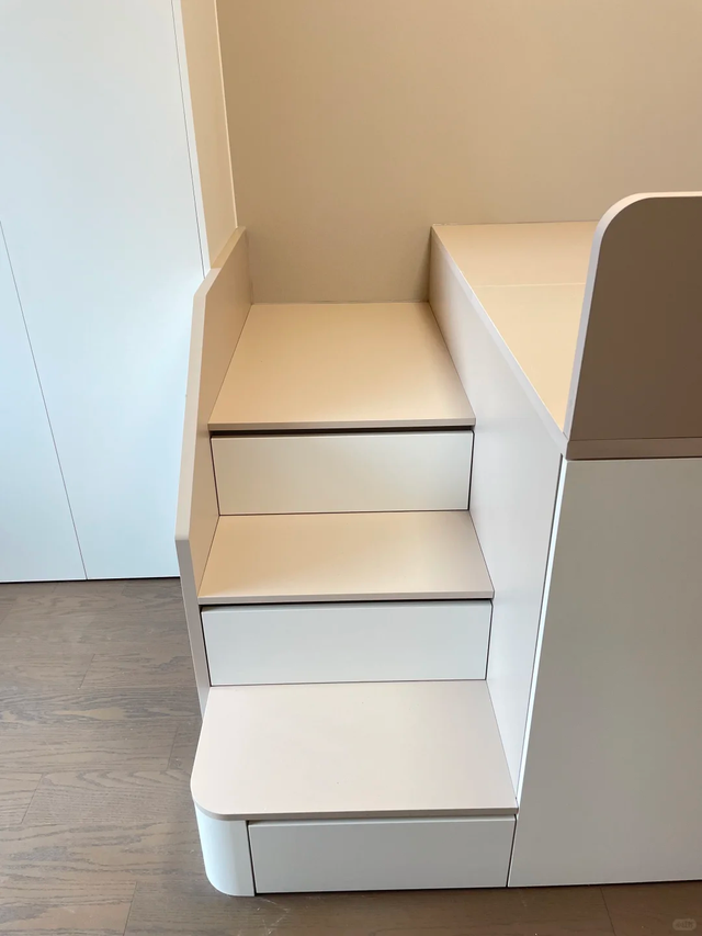 更妙的是细节设计:楼梯扶手做了斜角,防磕碰。梯步成了孩子的玩耍区域,都有抽屉都是可以拉出来的,可以放很多东西;