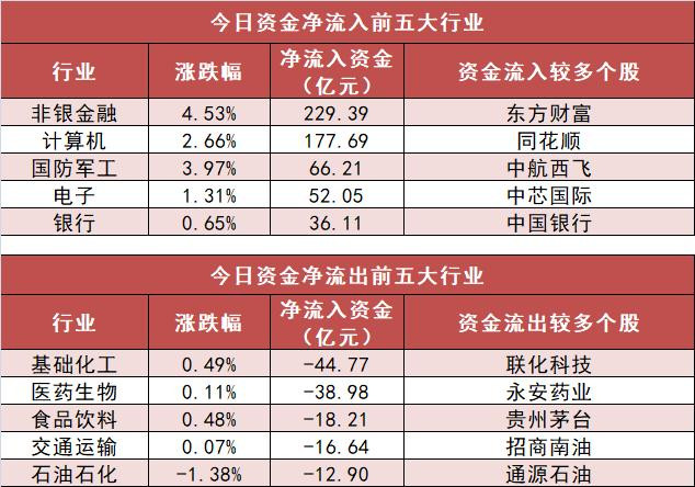 3.非银金融行业净流入229.39亿元居首