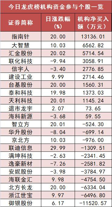 盘后龙虎榜数据显示,机构现身多股,其中指南针等股票呈现机构资金净买入,御银股份(002177)等股票呈现机构资金净卖出。